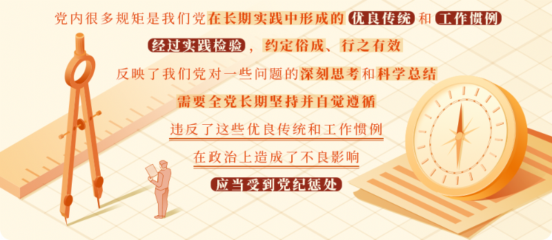 黨內(nèi)很多規(guī)矩是我們黨在長期實踐中形成的優(yōu)良傳統(tǒng)和工作慣例,經(jīng)過實踐檢驗,約定俗成、行之有效,反映了我們黨對一些問題的深刻思考和科學(xué)總結(jié),需要全黨長期堅持并自覺遵循。這些規(guī)矩看著沒有白紙黑字的規(guī)定,但都是一種傳統(tǒng)、一種范式、一種要求。違反了這些優(yōu)良傳統(tǒng)和工作慣例,在政治上造成了不良影響,應(yīng)當(dāng)受到黨紀(jì)懲處。